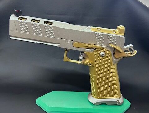 Meet our 5″ Government COS21 Dara Tri Top, designed with knurled serrations and chambered in 9mm. Its tactical steel frame has a full dust cover. Equipped with the innovative SV12 custom porting system this firearm delivers flawless performance with any bullet weight, shooting flatter and offering unmatched control.
