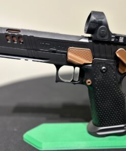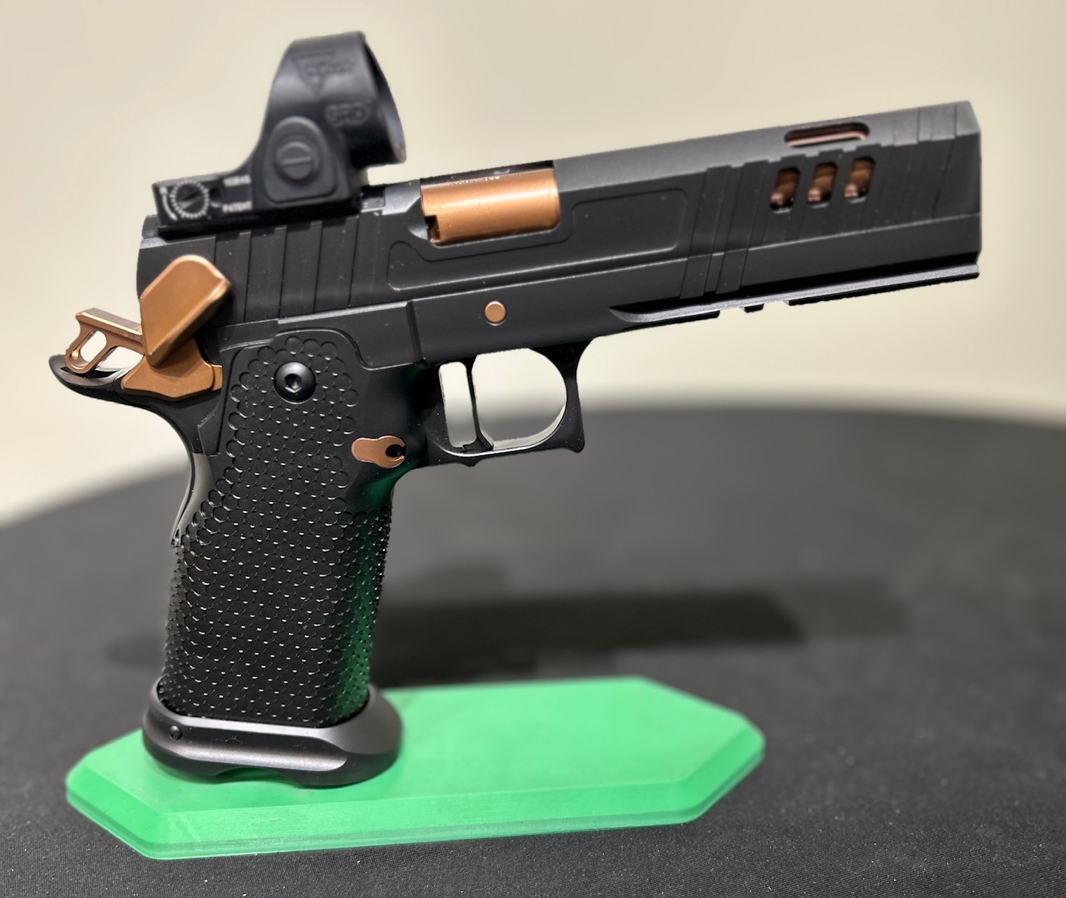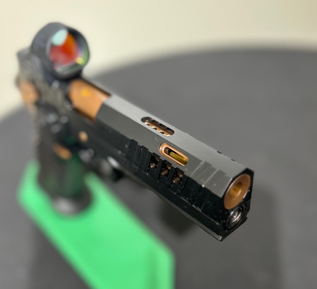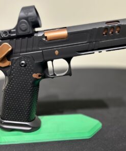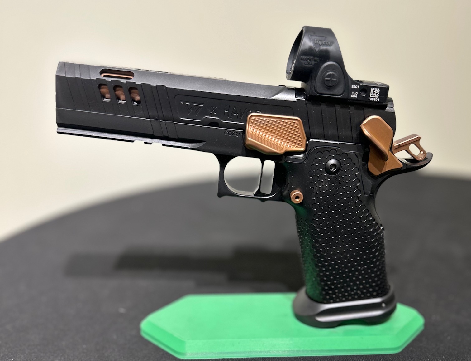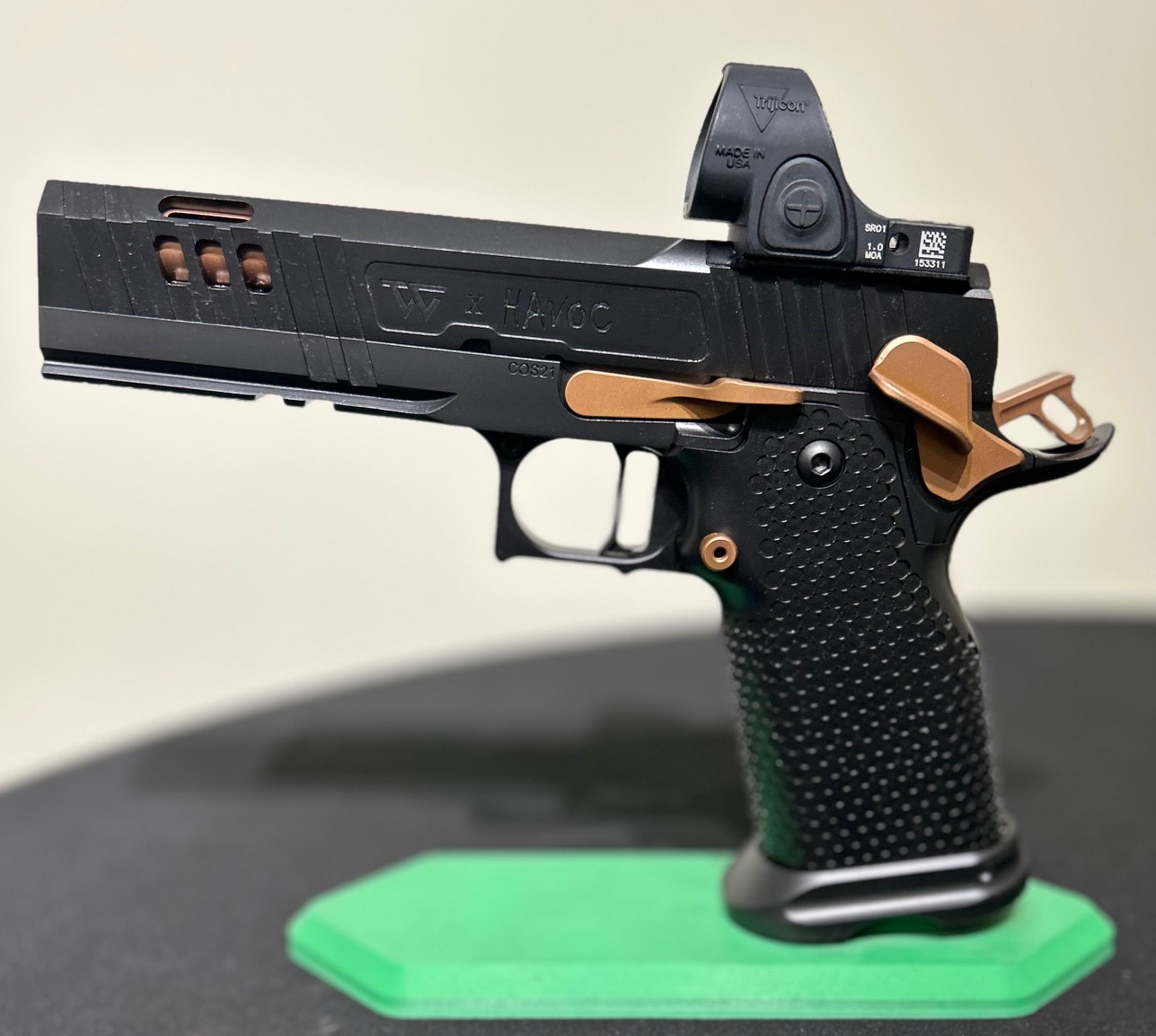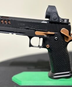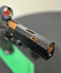 The latest in a series of Signature products we have named HAVOC Gen II. A Collaborative project by Jeff at the Weapon Collective and Charles at Major Havoc Gun Reviews. A Government length Tri Top with innovative hybrid porting. It has an inline as well as Slotted V ports which produce the ultimate soft/flat shooting gun. No front sight, optic prepped for a C&H plate, ambi-shielded safeties, Cheely aggressive Steel grip/magwell, EGW fire controls, extended slide stop, Red Dirt Trigger and DLC coated with Rose Gold (Copper) highlights. The next level up gun.