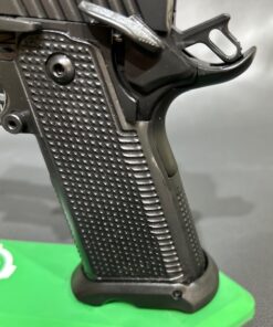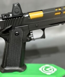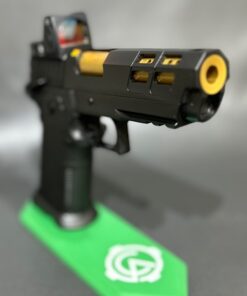 This is a new 4.25″ Tri Top Commander COS21 with Hybrid SV7 porting. Developed by barrowing from past classic guns, this has slide windows to lighten it as well as show off the TiN gold barrel. The rear serrations are deeper than usual which allows for a very sure grip when racking the slide. Other features include a tactical steel frame, no front sight, optic prepped with optic plate of choice, pinned grip safety, Cosaint Arms aluminum grip/magwell, EGW fire control kit, Red Dirt medium flat trigger, Cosaint Arms extended slide release, Cosaint Arms drilled and tapped mag release, and DLC coated.